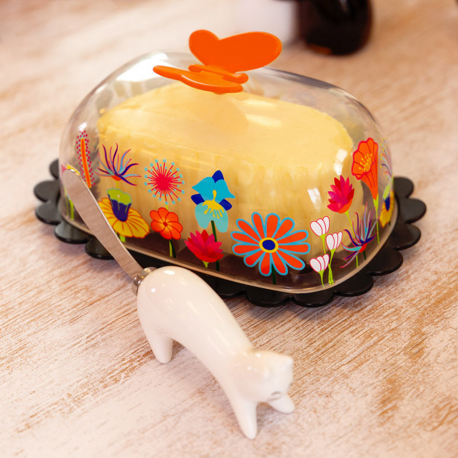 Die Brise der Wiesen weht direkt auf Ihren Tisch – mit Butter Fly! In der Mitte ruht Ihre Butter sanft auf ihrem grünen Bett, umgeben von verspielten Blumen und Schmetterlingen, die fröhlich umherzutanzen scheinen. Ihr poetisches und farbenfrohes Design bringt Frische und gute Laune auf Ihren Esstisch. Schluss mit der Alufolie, die jedes Mal reißt, wenn Sie Butter streichen möchten! Legen Sie einfach Ihr Standardstück Butter (250 g) auf die Basis und schließen Sie die Glocke, um sie hübsch und sauber aufzubewahren. Leicht zu handhaben und zu reinigen, ist Butter Fly spülmaschinenfest. Praktisch, elegant und voller Lebensfreude – er verwandelt das einfache Butterstreichen in einen fröhlichen, unbeschwerten Moment.
