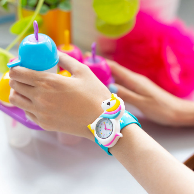Die Uhrzeit lesen zu lernen hat noch nie so viel Spaß gemacht! Unsere Uhren mit „Slap“-Armband sind perfekt für Kinder und Erwachsene. Mit einer einfachen Bewegung wickelt sich das Armband um das Handgelenk und passt sich perfekt an. Einfach und schnell! Mit bunten Designs, von niedlichen Tieren bis hin zu fantastischen Kreaturen ist für jeden Geschmack etwas dabei: Katzen, Einhörner, Drachen, Füchse und vieles mehr.