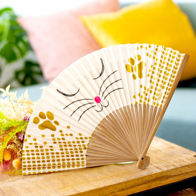 Ich bin leicht wie eine Feder und dennoch äußerst robust. Ich werde aus Bambus gefertigt, was mir diesen natürlichen und umweltfreundlichen Touch verleiht. Mit meinen verschiedenen Mustern passe ich mich jeder Situation an. Sie können mich ganz einfach in Ihre Handtasche stecken, und sobald Sie merken, dass die Temperatur steigt, bin ich einsatzbereit.