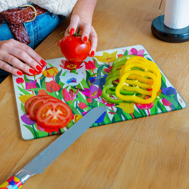 Discover the Commy glass cutting board: a versatile accessory designed to easily cut your foods, whether it's vegetables, fruits, or bread. But that's not all! This board can also be used as a cheese board, appetizer platter, or trivet. Heat-resistant up to 180°C, it combines practicality and elegance to meet all your culinary needs.