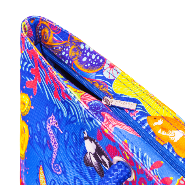 I keep your things safe, close with a handy zip, and even have a secret little inner pocket for neatly tucked-away treasures. And so you never lose a thing, I’ve thought of everything: my clever little clip hooks onto your purse, your keys, or any other treasure you’ve got rattling around. Big, light, and always ready for an adventure, I’m the perfect tote for carrying your cheerful chaos in style.