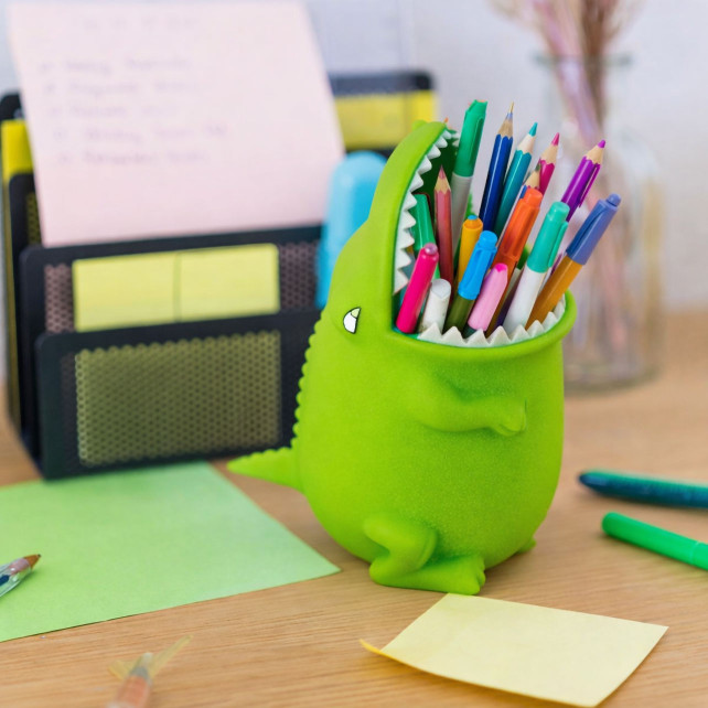 ¡Ñam! En tu escritorio devoro todos tus accesorios: lápices, bolígrafos, gomas y clips son mis platos favoritos. Y en el cuarto de baño, adoro el cepillo de dientes: ¡a ver cómo te defiendes!