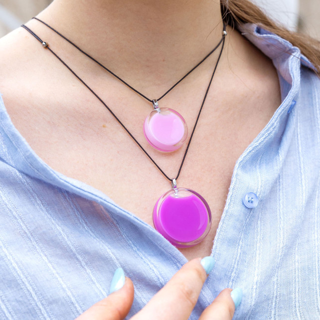 Realza tu cuello con nuestros colgantes de vidrio soplado, hechos a mano en nuestro taller de la región de París. Cada pieza es única y está disponible en una variedad de formas coloridas, rellena de materiales brillantes como perlas, purpurina o líquido.