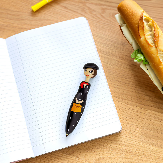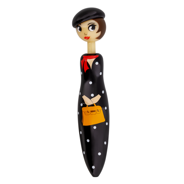 Toujours élégante, ce stylo Parisienne, avec sa robe noire à pois, son béret chic et son sac en bandoulière, incarne à merveille l’art de vivre à la française. Prête à griffonner un mot doux ou à remplir vos carnets d’inspirations, elle ne sort jamais sans son style… et son stylo ! Léger, pratique et rétractable, il se glisse facilement dans votre sac à main ou votre pochette, pour écrire partout avec panache.