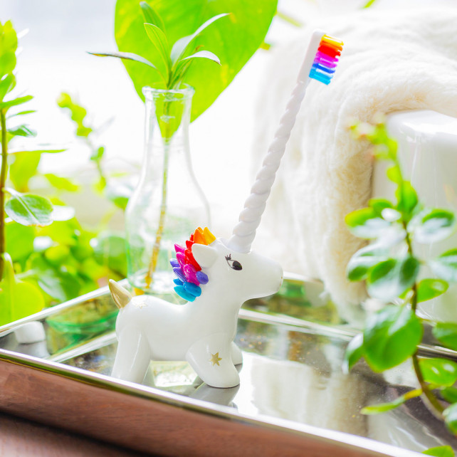 La mattina può essere difficile, e trasformarsi in un unicorno splendente non è sempre semplice… Ma con Unicornsmile, il sorriso dei tuoi bambini è in ottime mani! Questo pratico porta-spazzolino a forma di unicorno bianco protegge lo spazzolino e trasforma il tuo bagno in una vera fiaba.